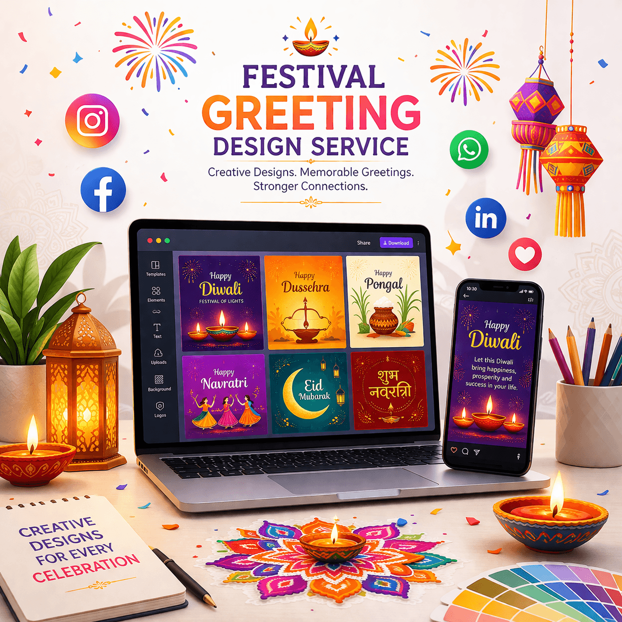 Our designs are thoughtfully created to align with your brand’s tone, colors, and message, ensuring consistency across all platforms. Whether it’s a traditional festival like Diwali or Holi, or modern celebrations such as New Year and corporate milestones, we design creatives that resonate with your audience and enhance engagement.